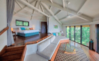 villa features an expansive and private sun deck with sun lounges and a beautiful outdoor rainforest