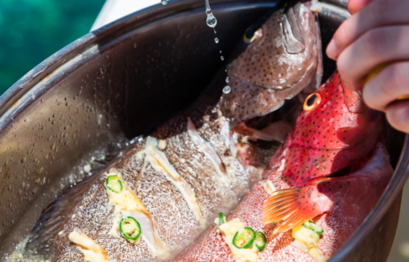 Our cuisine focuses heavily on the abundance of first class seafood pulled from the ocean that is our back yard. The seafood we eat is almost always caught on the day and fruit and vegetables come organically grown in our orchard.
